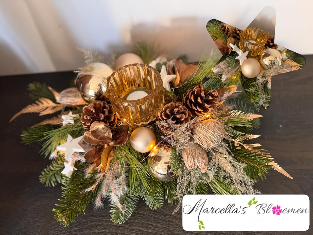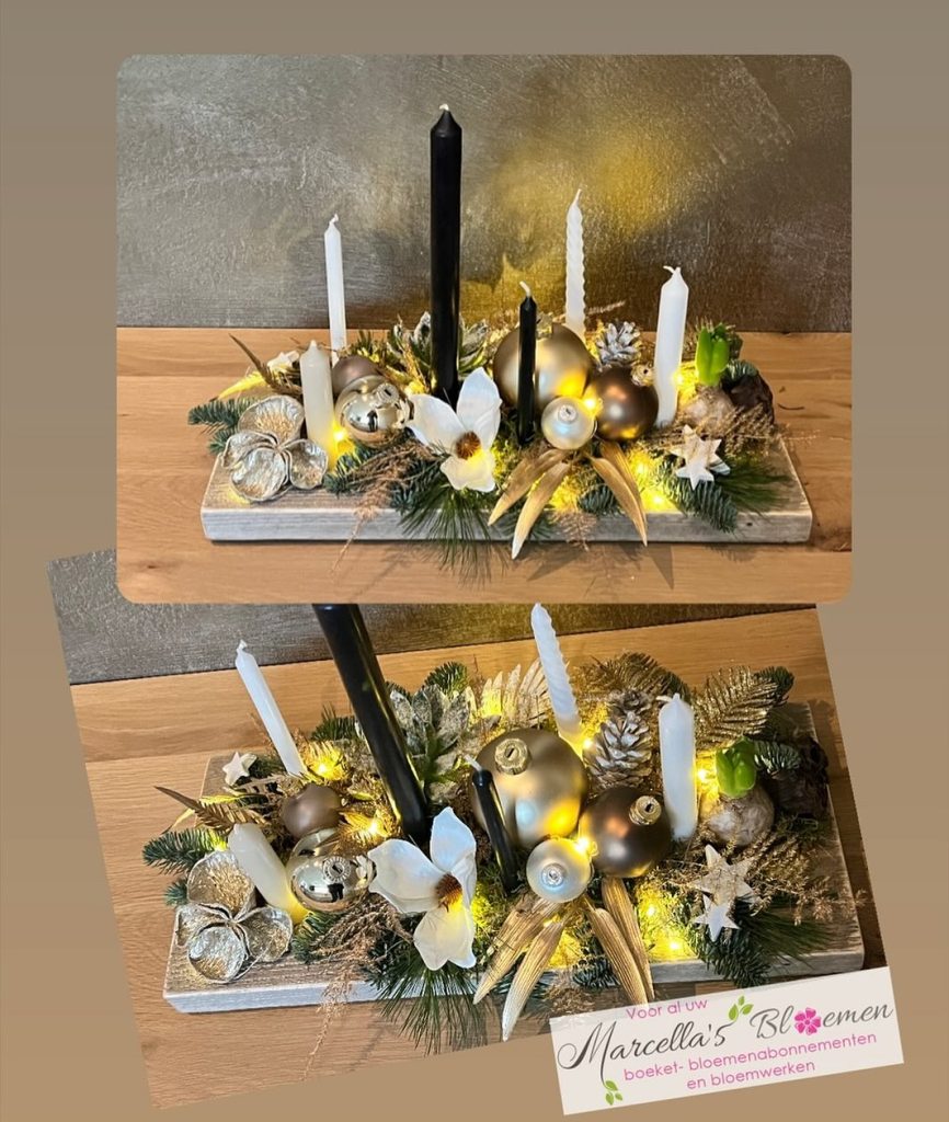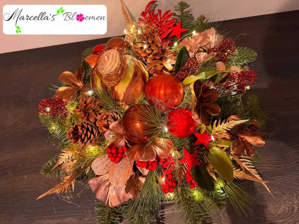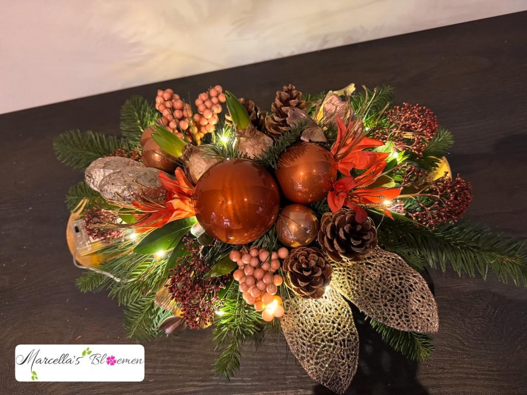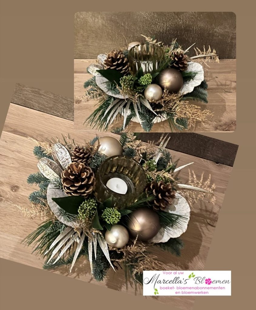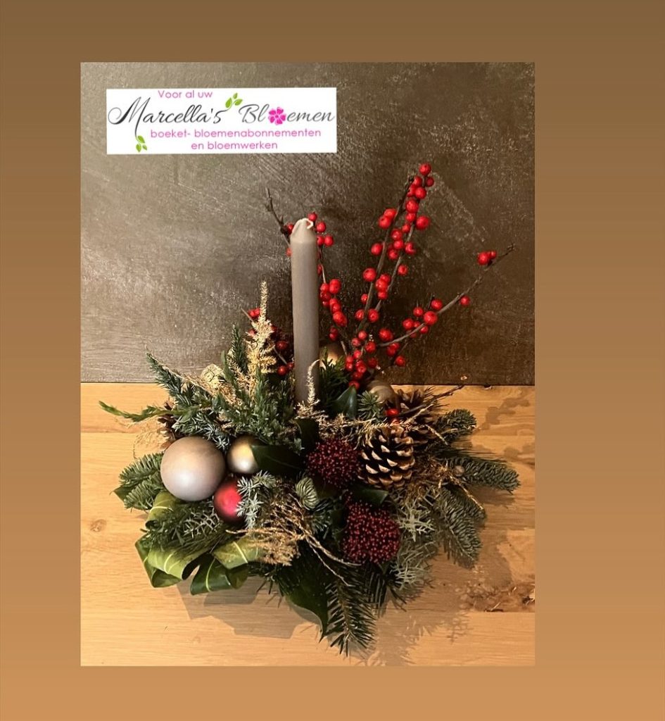 Zorg voor een warme kerstsfeer in huis met een kerststuk.