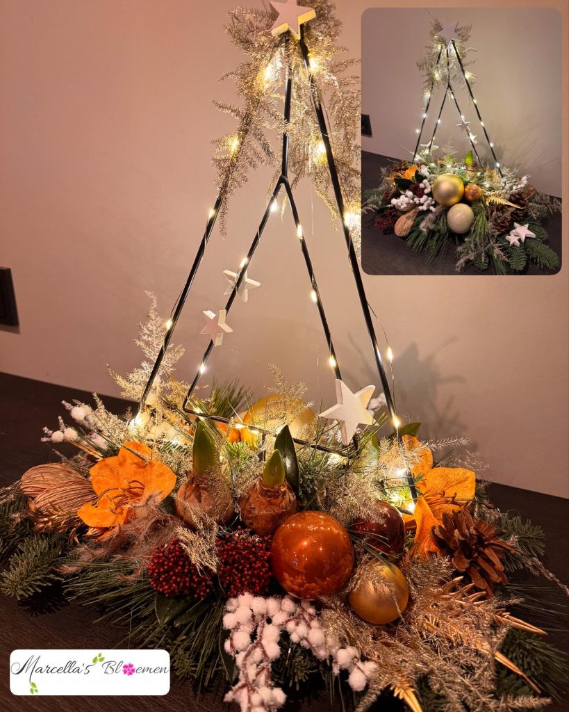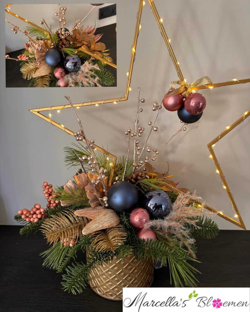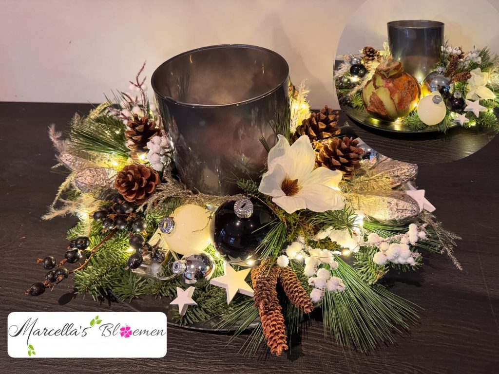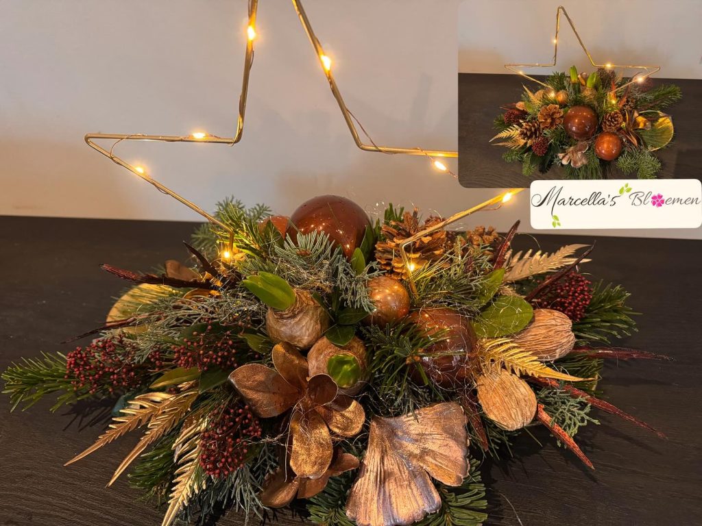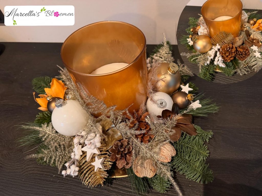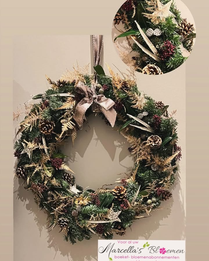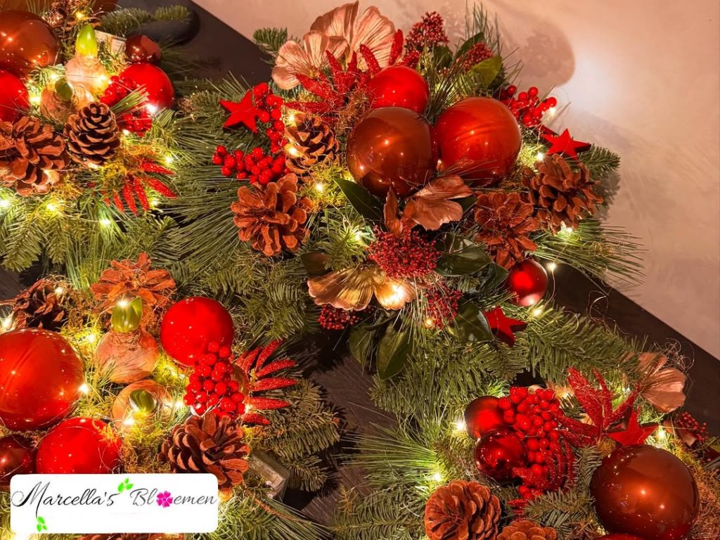 Zorg voor een warme kerstsfeer in huis met een kerststuk.